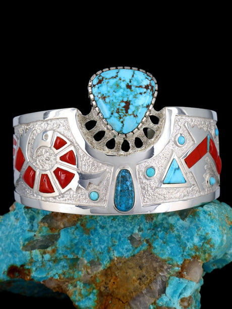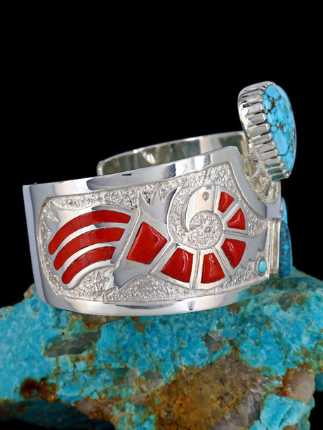 Native American Sterling Silver Kingman Turquoise and Coral Inlay Cuff Bracelet
