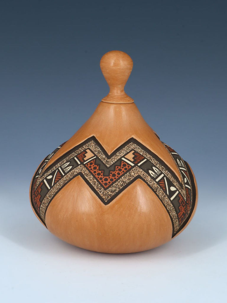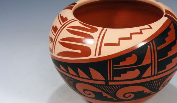 The Jemez Pueblo is located in Central-Northern New Mexico. The pottery produced there is known for its distinctive earth-tone colors blending stone polished and matte finishes with painted and etched designs. The people of Jemez abandoned the craft of pottery making sometime in the early 18th century and relied instead on purchasing wares from other Pueblos, mostly Zia. Eventually they began to create their own work again during the 1920s and 30s, incorporating Zia's traditional designs and styles. It was not until the late 70s or 80s when Jemez pottery, with the help of noted potters such as Juanita Fragua and Mary Small, that Jemez pottery began to take on more distinctive designs and qualities that have made it very popular among collectors and enthusiasts. We carry works from artists Linda Fragua and daughter Chrislyn Fragua, along with pieces from Judy Toya, Juanita Fragua, Mary Lucero, Diane Lucero, Mary Lewis and numerous other award winning Jemez Pueblo artists.