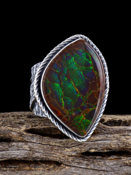 Navajo Tufa Cast Sterling Silver Ammolite Ring Size 9.5
