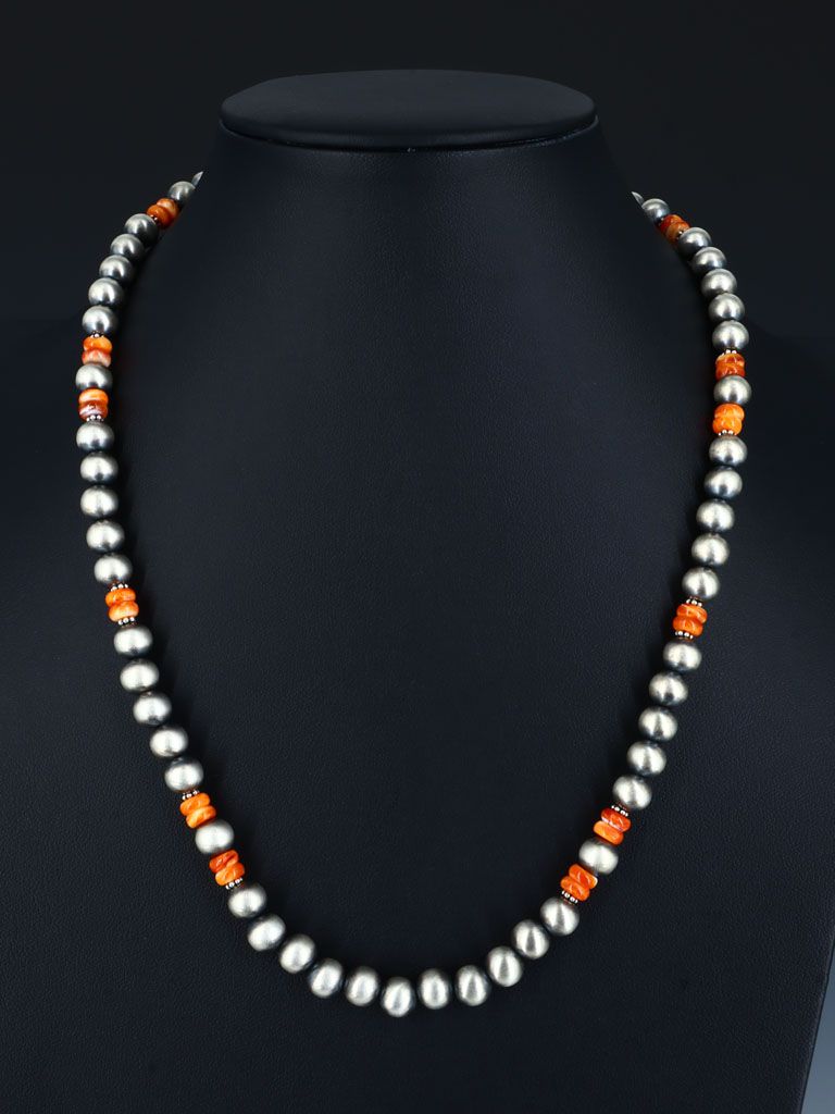Native American Spiny Oyster and Turquoise Silver Beaded Necklace