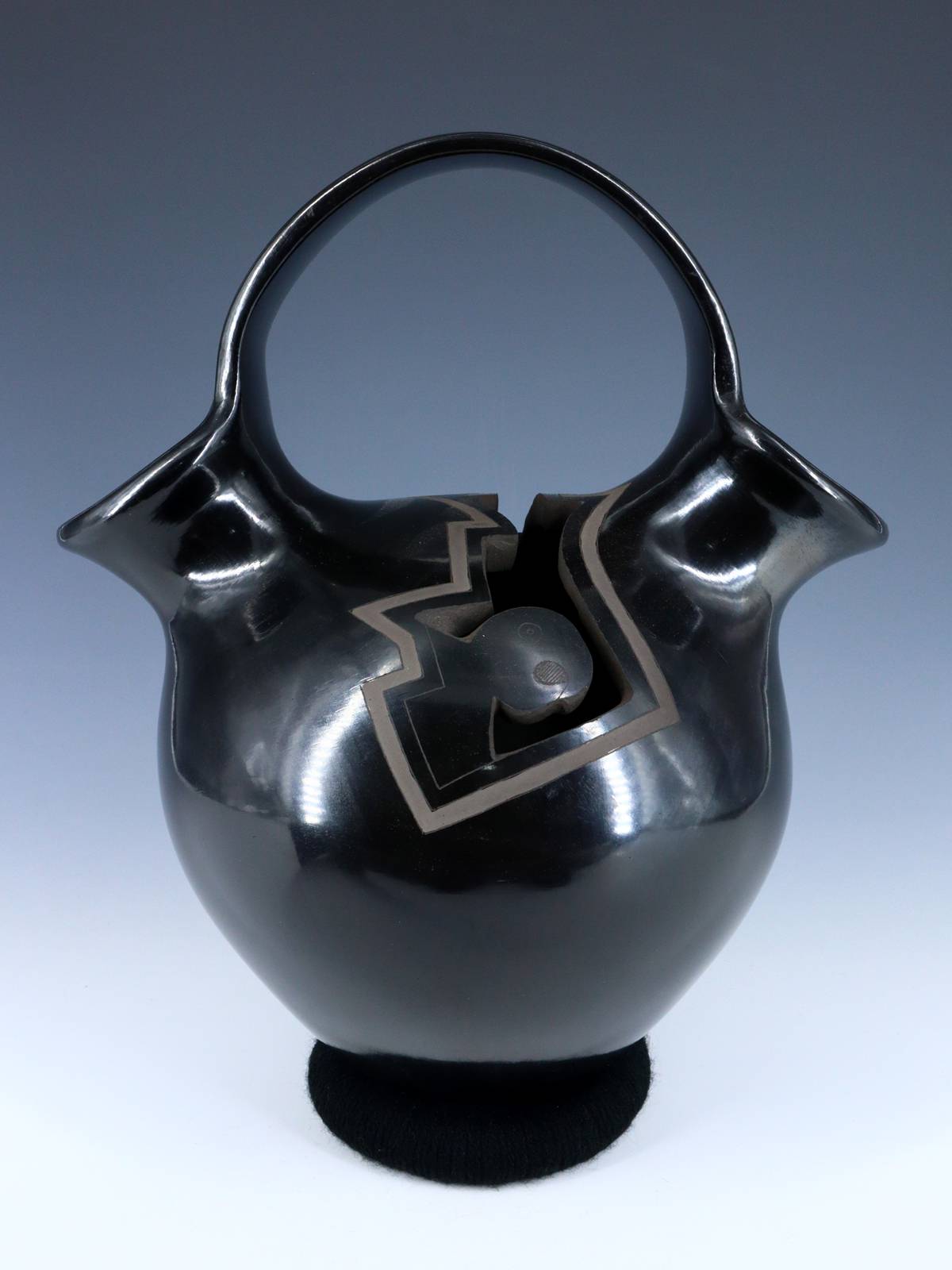 Casas Grandes (Paquime) is a prehistoric archeological ruin near Chihuahua, Mexico. In the early 1970's, a Mexican railroad worker named Juan Quezada began reproducing pottery in the authentic traditions of Casas Grandes. Today, his pots are in the permanent collections of the Smithsonian, and he is the foremost living ceramic artist in Mexico. Most of Juan's family and over 300 other households in his home village, Mata Ortiz, now follow his path. The pots are formed by only the potter's hands; No pottery wheels are used. The clay is obtained locally from around the village using pick-axes and shovels. The paints used are also natural. The pottery is dung-fired on the ground, not in a kiln. Lastly, each piece is signed by the artist. Casas Grandes (Mata Ortiz) pottery began as a revival of ancient traditions, but has developed a distinctive artistic style all it's own.