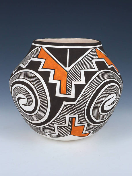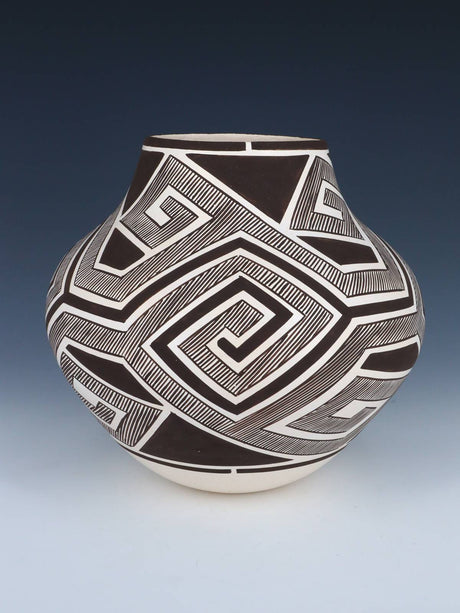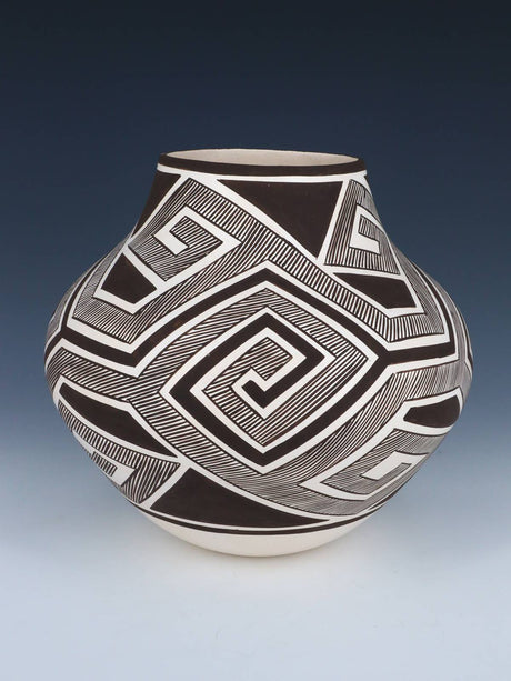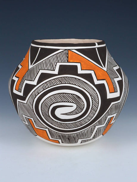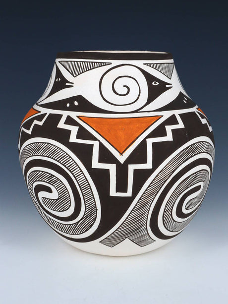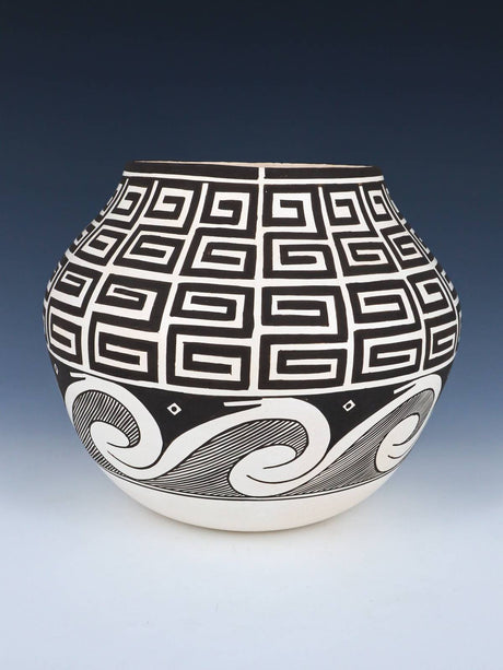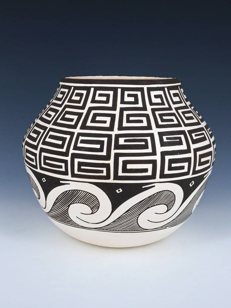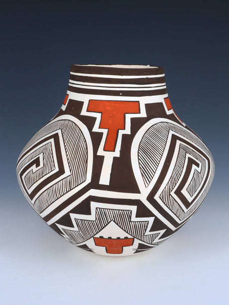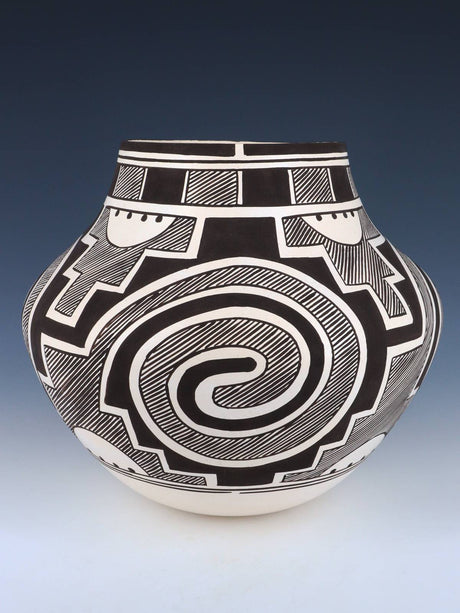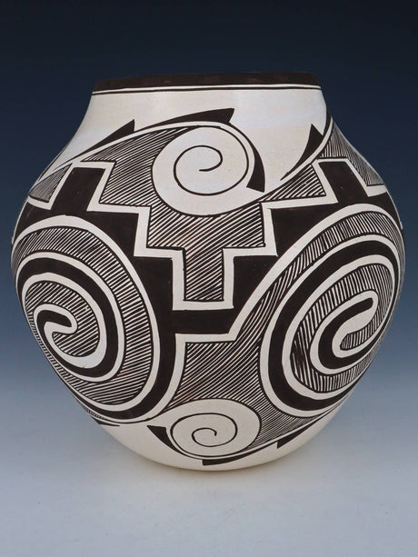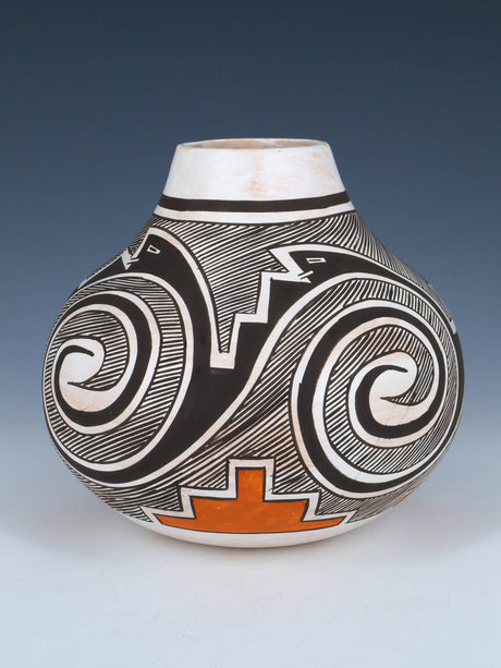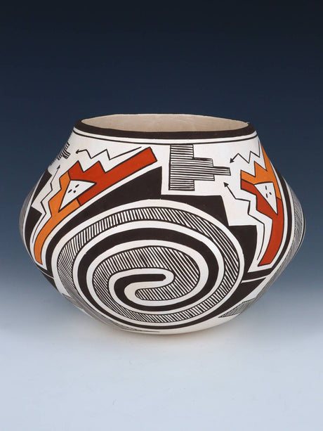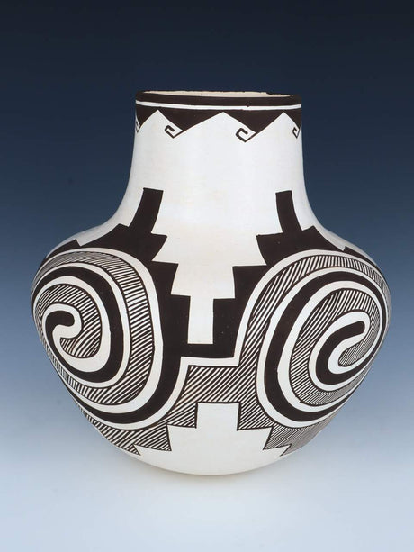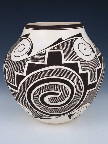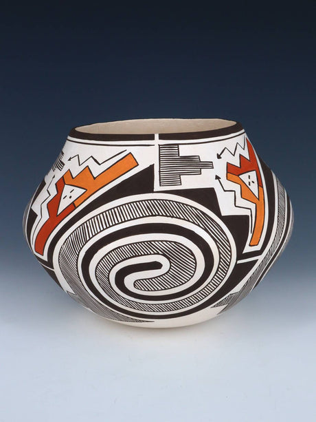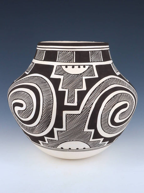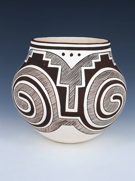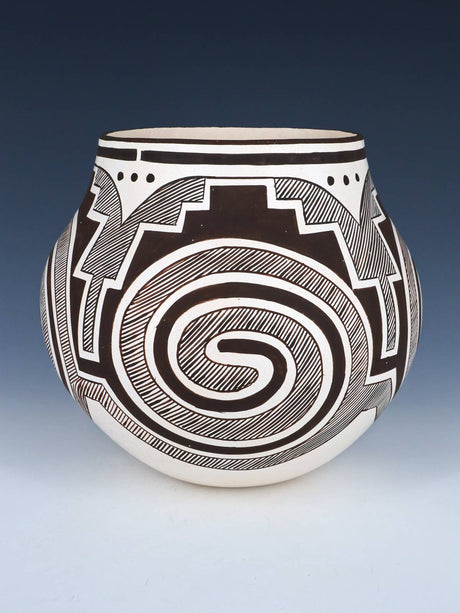 Myron specializes in hand coiled traditional pottery. Most of Myron’s designs originated from the Tularosa basin in southern New Mexico. These prehistoric swirl patterns along with various fine line work are his specialty. He duplicates ancient designs from old broken pottery shards found on ancient grounds. Myron uses all natural pigments to construct his high quality pottery. Myron signs his work as: Myron Sarracino, Laguna Pueblo.