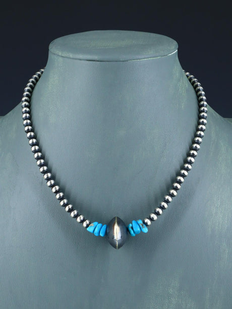 Native American Turquoise Nugget and Silver Bead Choker Necklace