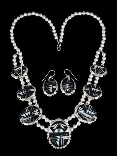 Navajo Jewelry Onyx and Opalite Inlay Necklace and Earrings Set