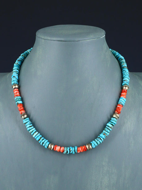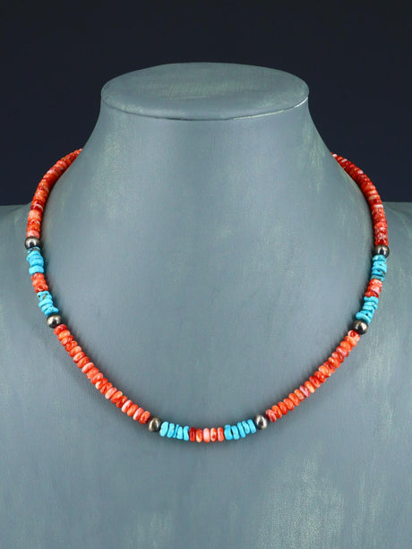 Native American Jewelry Single Strand Turquoise and Spiny Oyster Necklace