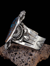 This bracelet features a Pilot Mountain turquoise stone set in sterling silver. This piece is signed by the artist.