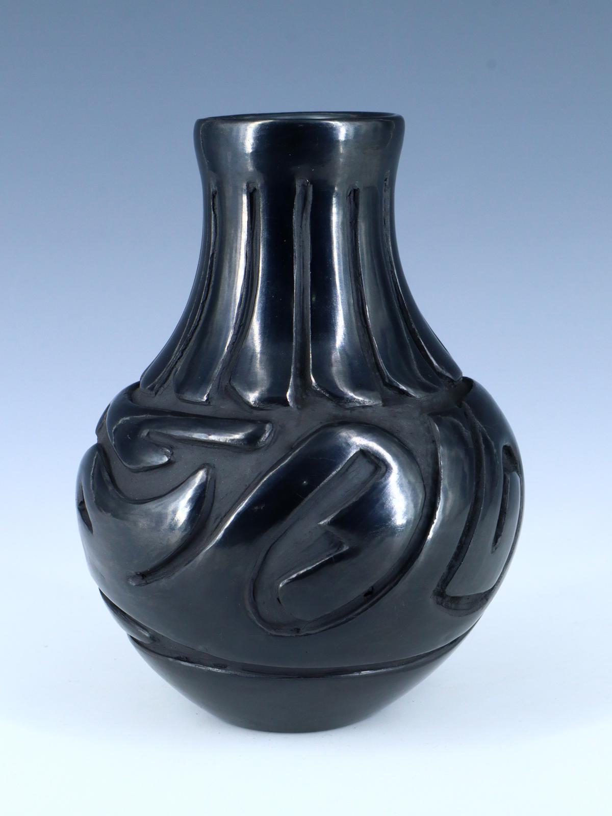 Stone polished and hand-coiled black-ware pottery. Signed by the artist.