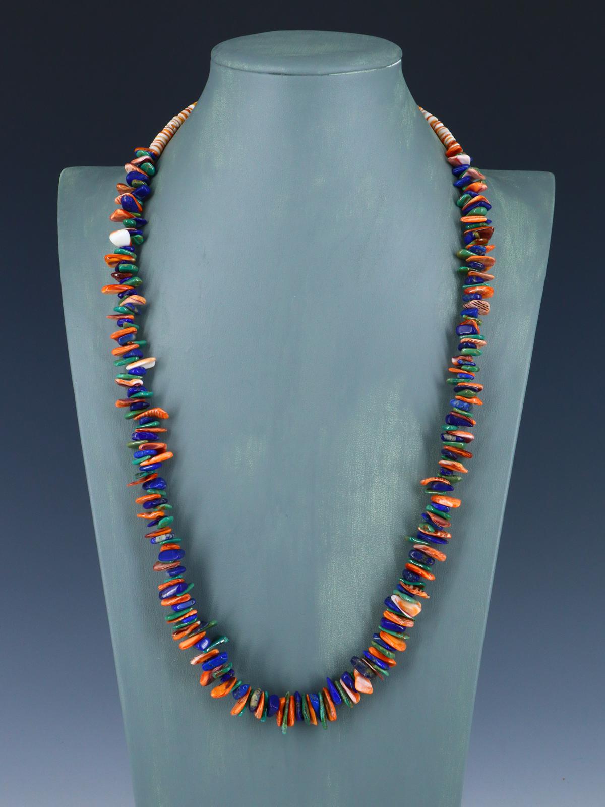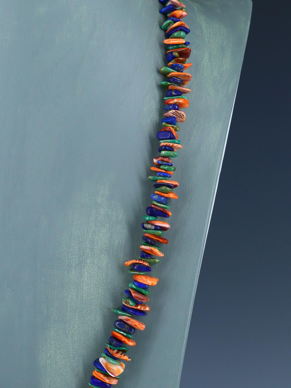 Una sola hebra gruesa de discos de color turquesa verde y azul rematada con un gancho y un cierre de ojo de plata esterlina. De la artista navajo, Emma Singer.