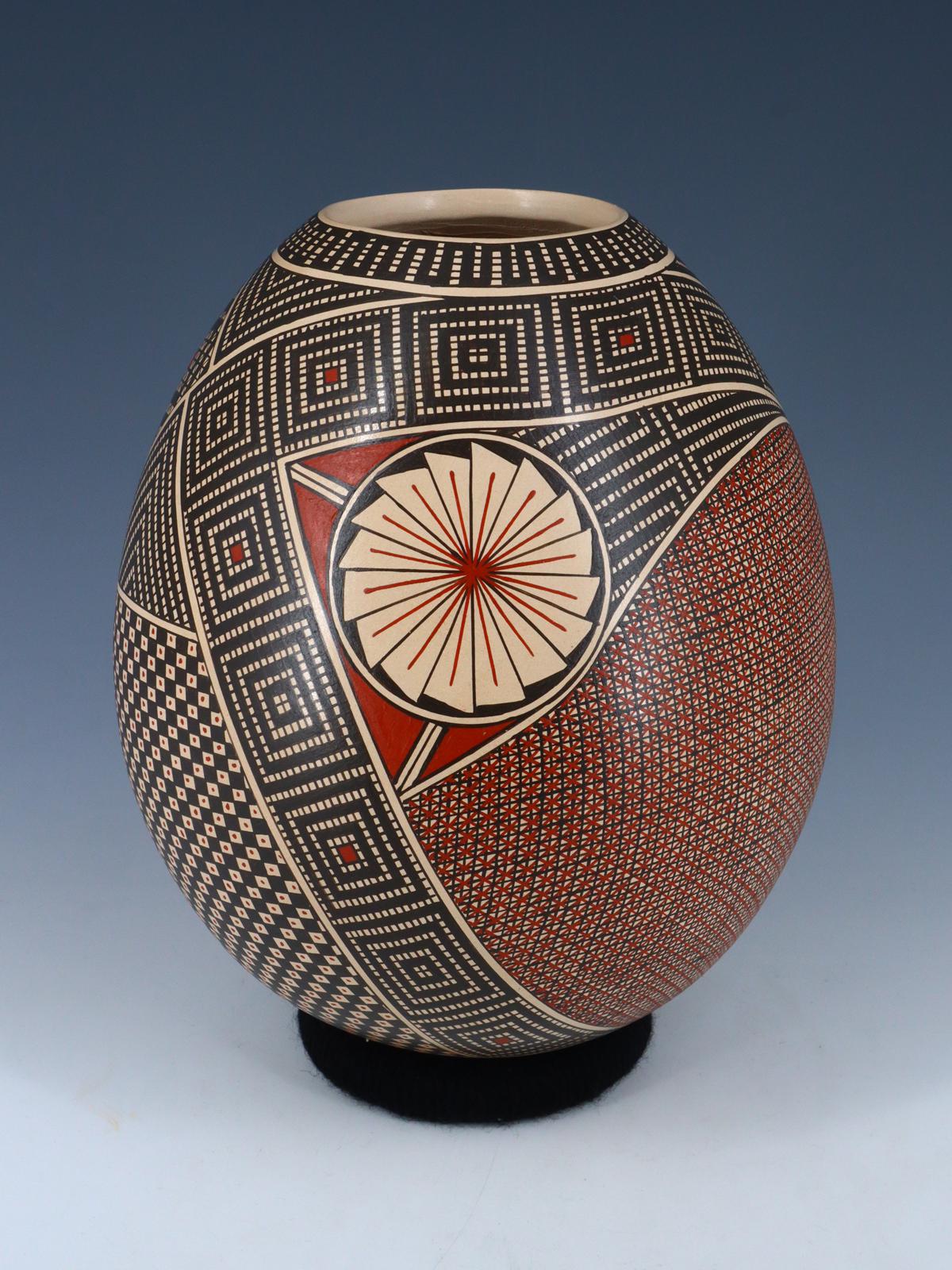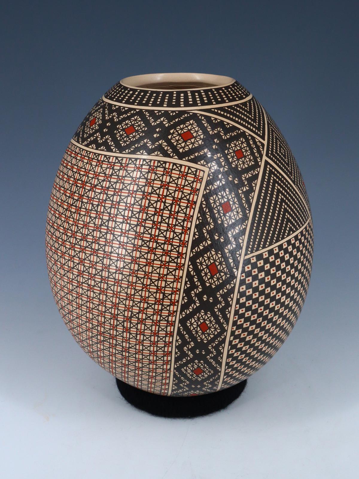 Graciela Martínez es la esposa de la superestrella de Mata Ortiz, Goyin Silveira, pero ella misma está ganando rápidamente fama entre los coleccionistas. A menudo colabora con Goyin en sus piezas y su trabajo es excepcionalmente detallado. Esta gran pieza enrollada a mano está pintada con sus intrincados patrones geométricos y de encaje estilo Paquimé. Este jarrón está firmado por el artista. Incluye soporte para anillos.