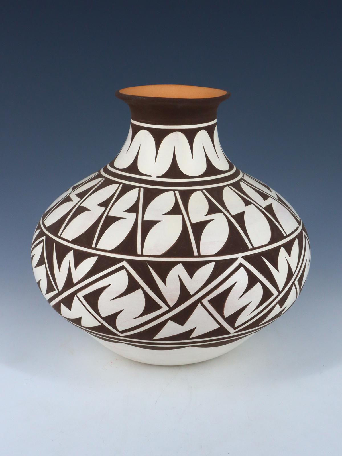 Anderson Peynetsa es hermano de Priscilla e hijo de Wilma Jean Peynetsa. Anderson comenzó a hacer cerámica en octavo grado y en los últimos diez años se ha convertido en un destacado artesano. Es uno de los alfareros más conocidos del pueblo Zuni que trabaja dentro del estilo tradicional. Esto implica recolectar la arcilla y los pigmentos naturales utilizados para pintar los diseños en la cerámica del área alrededor del Pueblo Zuni. Sus vasijas de paredes delgadas están enrolladas a mano y cocidas al aire libre (no en un horno), y los diseños que aparecen en ellas son una progresión de los diseños tradicionales de sus antepasados. Anderson es un maestro en la interpretación de los diseños antiguos para producir sus temas contemporáneos. Sus jarras suelen ser grandes, pero exudan un notable atractivo de suavidad y equilibrio. Su diseño Walking-Deer lo ha hecho famoso, pero también fabrica extravagantes macetas Peering-Lizard en las que las cabezas de varios geckos se extienden sobre el borde de la maceta. Al hacer sus vasijas, Anderson suele contar con la ayuda de su esposa, Aurelia, quien pule sus creaciones de arcilla. Esta pieza está firmada. Esta olla está firmada.