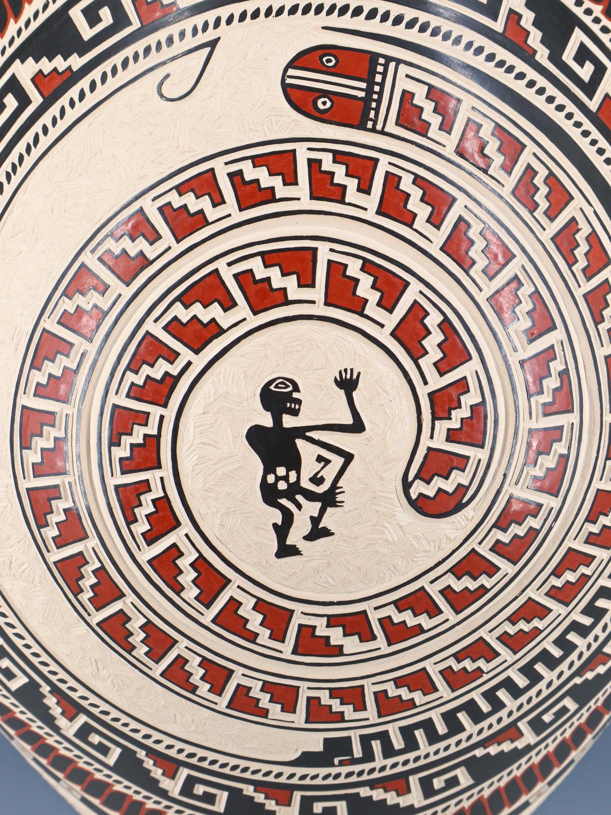 Cette belle pièce a été réalisée à la main par l'artiste Belinda Ponce et est gravée de motifs complexes sur la base en pierre polie. Comprend un support pour bagues en poterie peinte assortie. Cette pièce ne comporte aucune marque d’artiste déchiffrable.