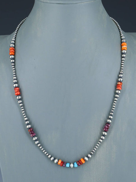 18" Native American Spiny Oyster and Silver Bead Necklace