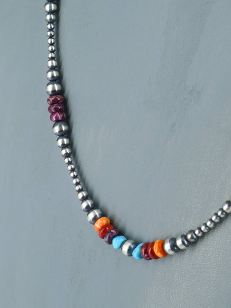 Native American Turquoise, Spiny Oyster and Silver Bead Necklace