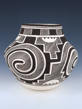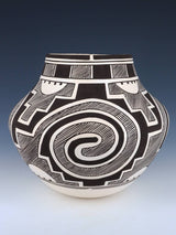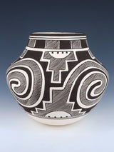 Myron specializes in hand-coiled traditional pottery. Most of Myron’s designs originated from the Tularosa basin in southern New Mexico. These prehistoric swirl patterns along with various fine line work are his specialty. He duplicates ancient designs from old broken pottery shards found on ancient grounds. Myron uses all natural pigments to construct his high quality pottery. Myron signs his work as: Myron Sarracino, Laguna Pueblo.